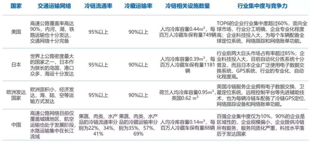歐、美、日等冷鏈起源較早,19世紀上半葉隨著冷凍機的發明,冷鏈開始逐步形成,歐美地區的食品冷鏈體系早在20世紀30年代初步建立,目前歐美日等發達國家冷鏈行業發展歷史已有150余年,已十分成熟,而中國冷鏈物流行業在上世紀60年代才將將起步,其發展歷史不過50余年。中國冷鏈物流行業在交通運輸網絡,冷鏈相關設施數量、冷鏈流通率和冷藏運輸率、行業集中度和競爭力等各方面都落后歐美日地區,中國冷鏈物流行業目前總體還處于發展階段,行業發展迅速,潛力巨大。